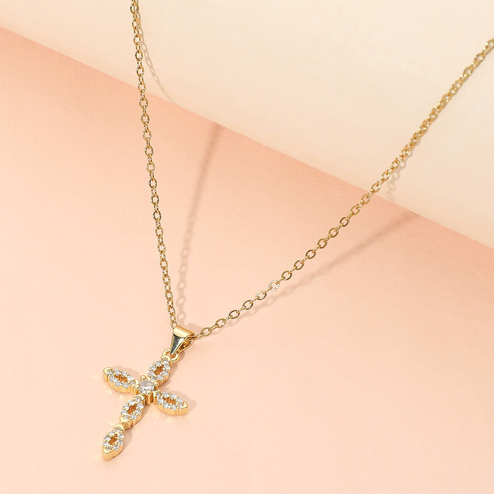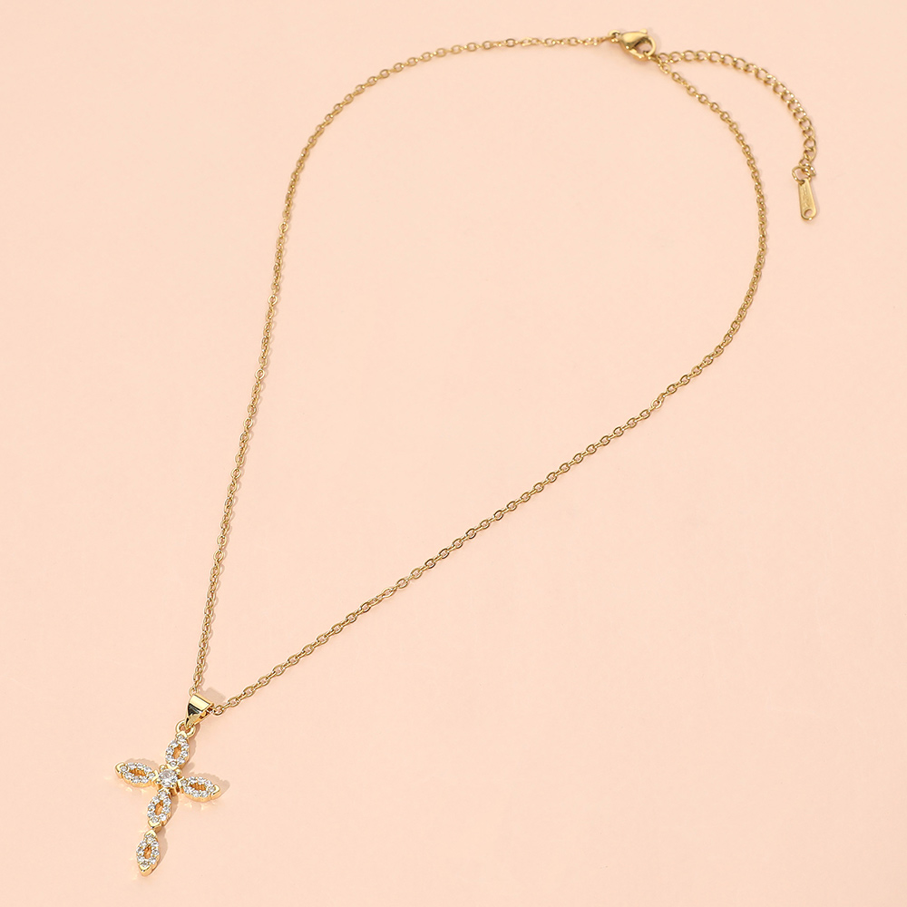 Details • Necklace Size : 15.5" + 2.25" L • Pendant Size : 0.7" X 1.25" • This CZ cross pendant chain necklace features a delicately detailed cross charm accented with shimmering stones for a timeless and meaningful look. Designed for effortless everyday wear or layered styling, it offers elegant symbolism and versatile appeal ideal for gifting, boutiques, and curated jewelry collections. • CZ Cubic Zirconia • Stainless Steel