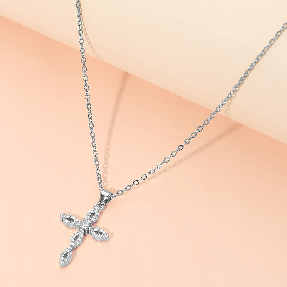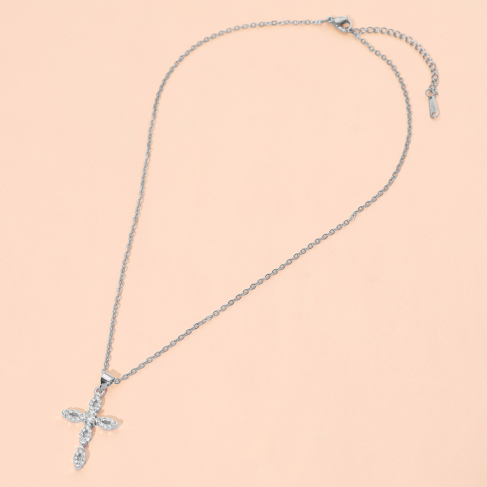 Details • Necklace Size : 15.5" + 2.25" L • Pendant Size : 0.7" X 1.25" • This CZ cross pendant chain necklace features a delicately detailed cross charm accented with shimmering stones for a timeless and meaningful look. Designed for effortless everyday wear or layered styling, it offers elegant symbolism and versatile appeal ideal for gifting, boutiques, and curated jewelry collections. • CZ Cubic Zirconia • Stainless Steel