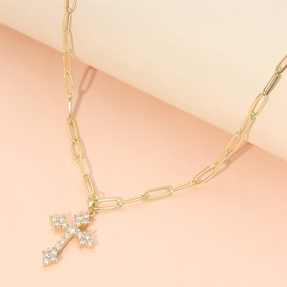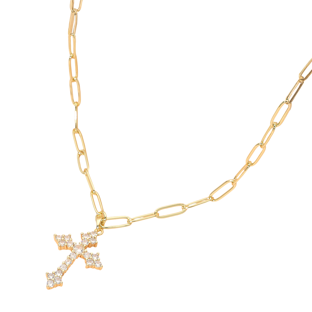 • This CZ cross pendant paperclip chain necklace showcases a refined cross charm accented with sparkling stones for a clean, modern statement. Designed to balance faith-inspired symbolism with everyday style, it layers effortlessly or stands alone, making it a versatile choice for gifting, boutique displays, and curated jewelry assortments.