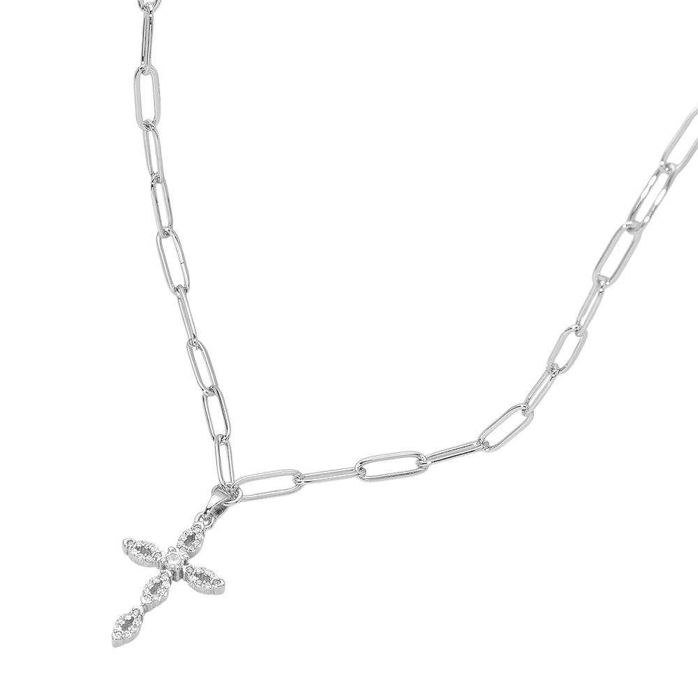 Details • Necklace Size : 15.75" + 2.25" L • Pendant Size : 0.7" X 1.25" • This CZ cross link chain pendant necklace showcases a modern elongated chain paired with a sparkling cross charm for a refined statement. Designed for everyday styling or layering, it delivers timeless symbolism, subtle shine, and versatile appeal perfect for boutique and gift-ready jewelry collections. • CZ Cubic Zirconia • Stainless Steel