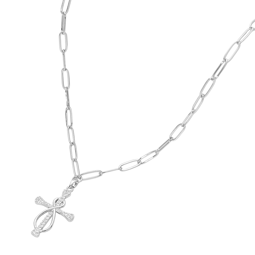 Stainless Steel CZ Stone Paved Knot Cross Charm Pendant Paperclip Chain Necklace