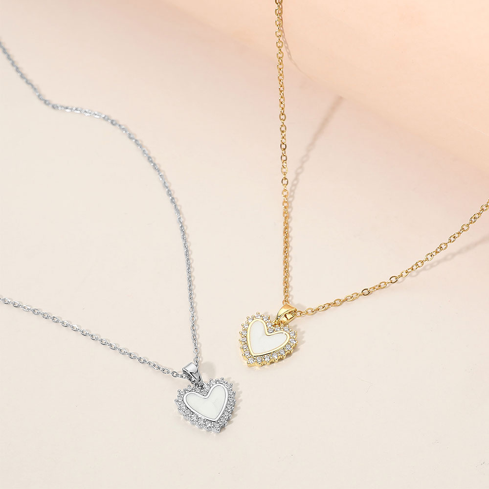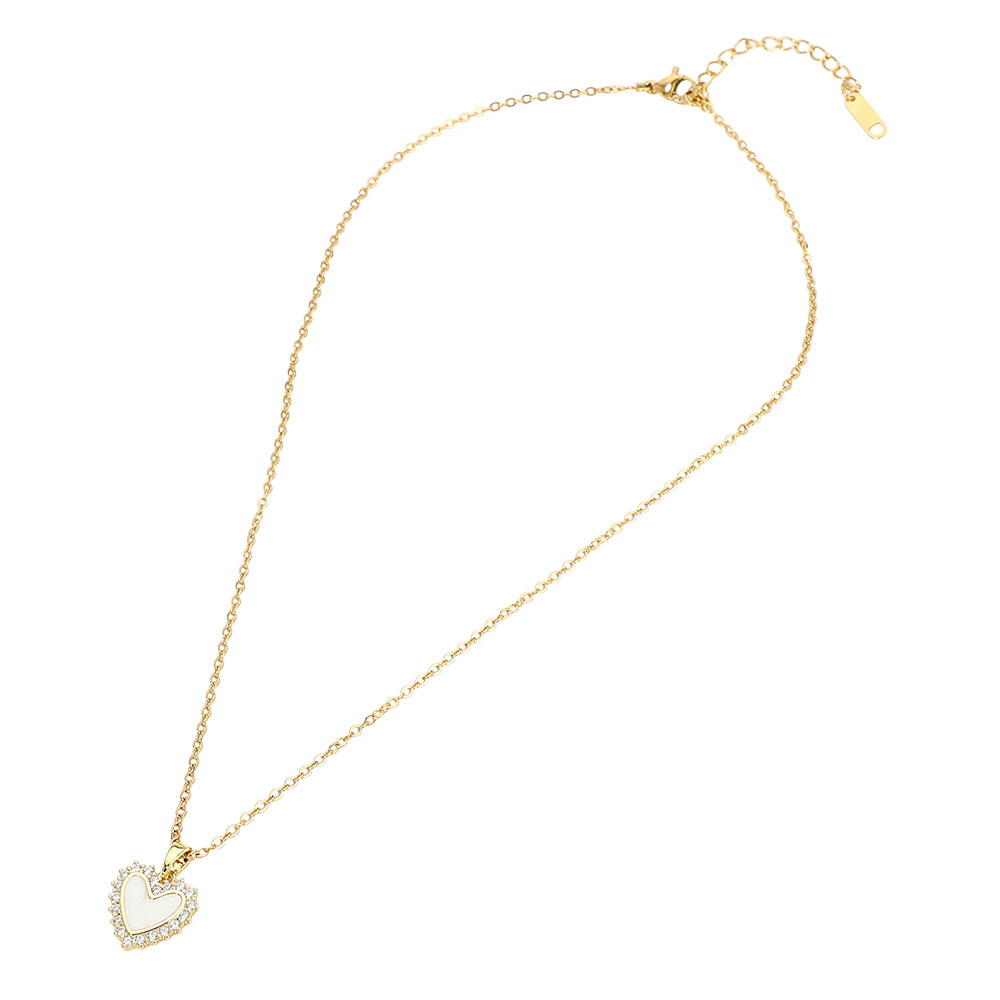 Details • Necklace Size : 15.5" + 2" L • Pendant Size : 0.6" X 0.75" • Elegant mother of pearl heart charm pendant necklace featuring a refined cz pave-style border and smooth center detail. Designed for everyday wear or special occasions, this timeless necklace adds a romantic, polished touch to layered looks or standalone styling, making it an ideal choice for gift shops, boutiques, and trend-focused accessory collections. • CZ Cubic Zirconia • Stainless Steel