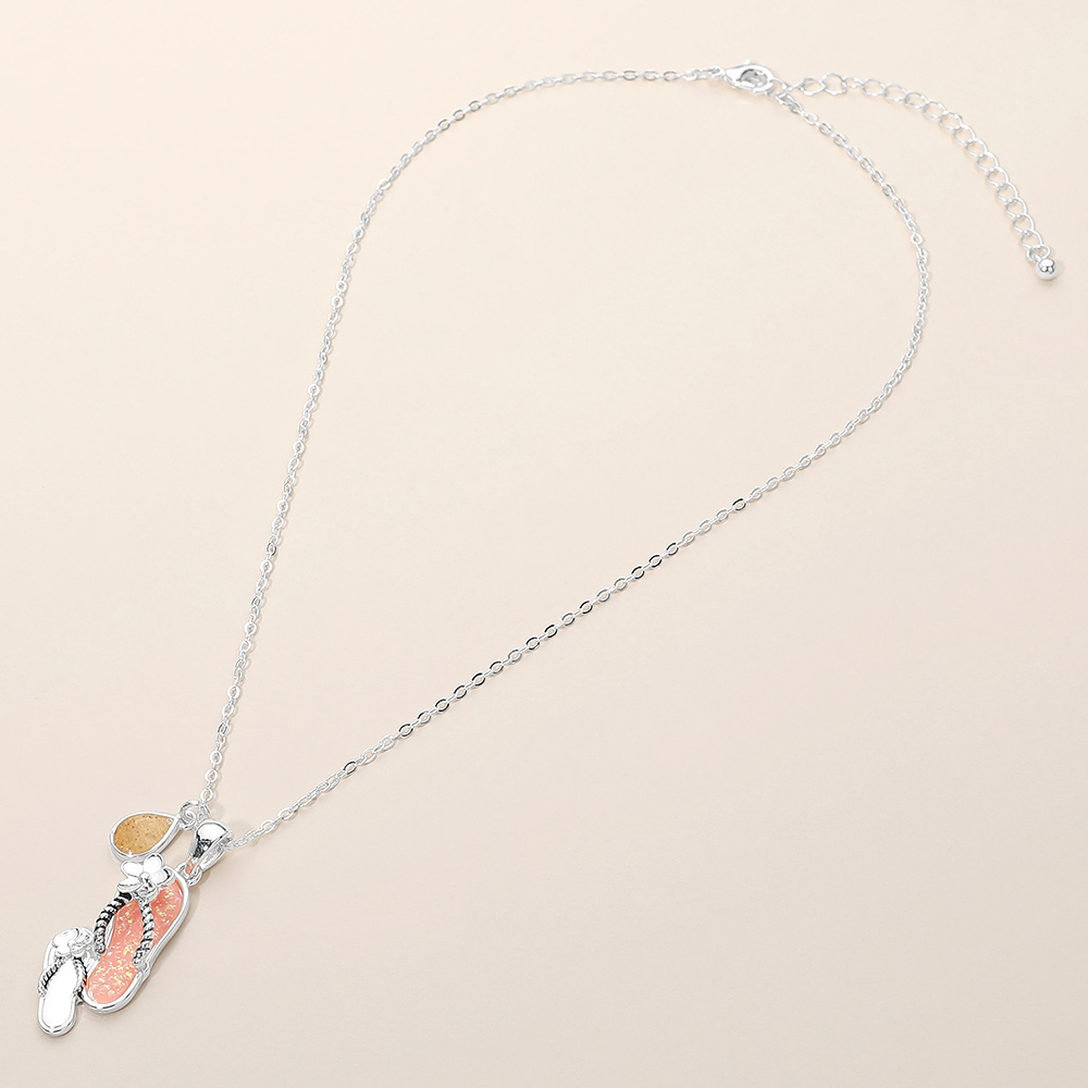 • Playful flip flop charm necklace featuring a beach inspired pendant with a dangling accent for added movement. Designed for casual styling, summer outfits, and vacation looks, this necklace layers easily with other jewelry and makes a fun gift for coastal themes, resort wear, and everyday accessories collections.