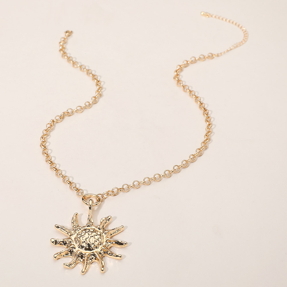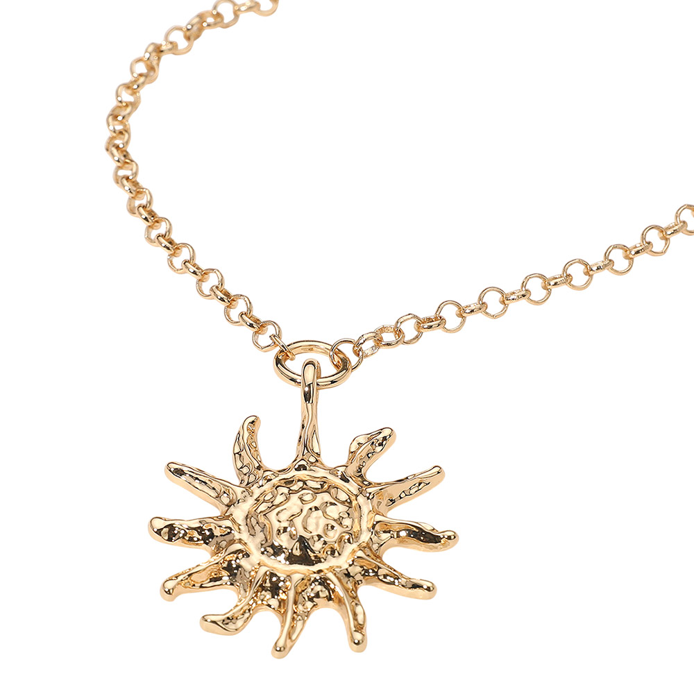 Details • Necklace Size : 16.5" + 3.25" L • Pendant Size : 1.75" X 2.25" • Shine bright with this radiant sun pendant necklace featuring a bold, textured design that symbolizes warmth and vitality. The elegant linked chain and eye-catching pendant make it a stunning statement piece, perfect for adding a touch of brilliance to any outfit or occasion. • Lead and Nickel Compliant