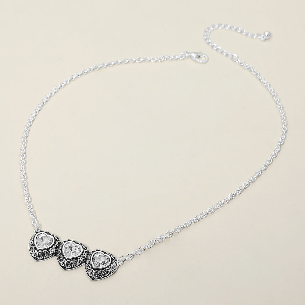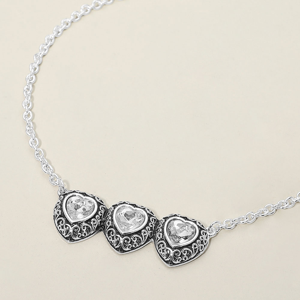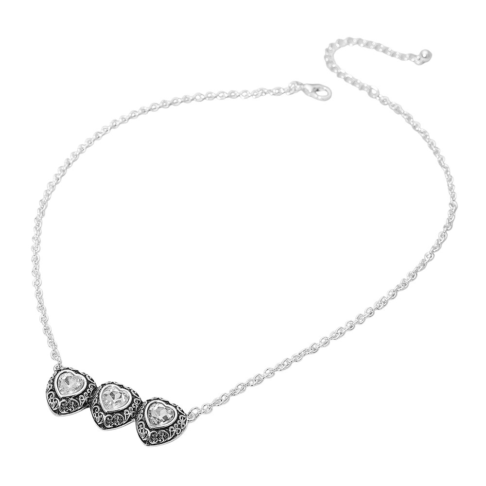 Details • Necklace Size : 18" + 3" L • Pendant Size : 1.9" X 0.7" • Showcase romantic style with this triple heart pendant necklace featuring detailed framed accents on a delicate chain. A charming statement piece ideal for everyday wear or special occasions, offering graceful shine, balanced design, and comfortable lightweight appeal. • Lead and Nickel Compliant
