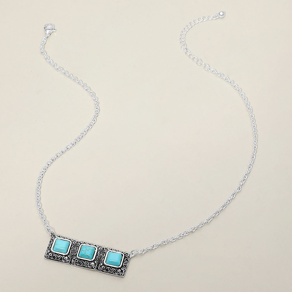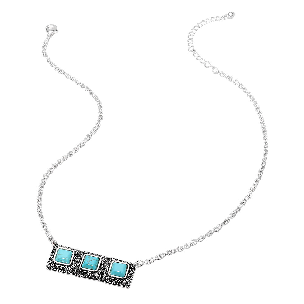 Details • Necklace Size : 18" + 3" L • Pendant Size : 1.9" X 0.7" • Add this triple square stone pendant necklace featuring an ornate framed bar design on a sleek chain. A versatile statement piece perfect for everyday styling or special occasions, offering balanced shine, graceful detail, and lightweight comfort. • Lead and Nickel Compliant