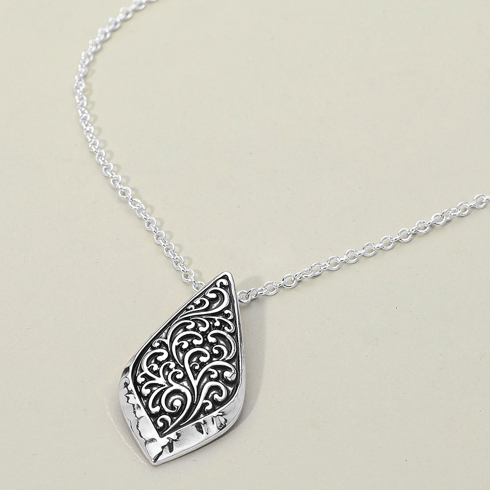 Details • Necklace Size : 18" + 3.5" L • Pendant Size : 0.8" X 1.6" • Elevate your look with this artisan leaf pendant necklace featuring an elegant scrollwork pattern and refined two-tone finish. Its unique craftsmanship blends classic artistry with modern sophistication, making it a standout accessory for any occasion. • Lead and Nickel Compliant