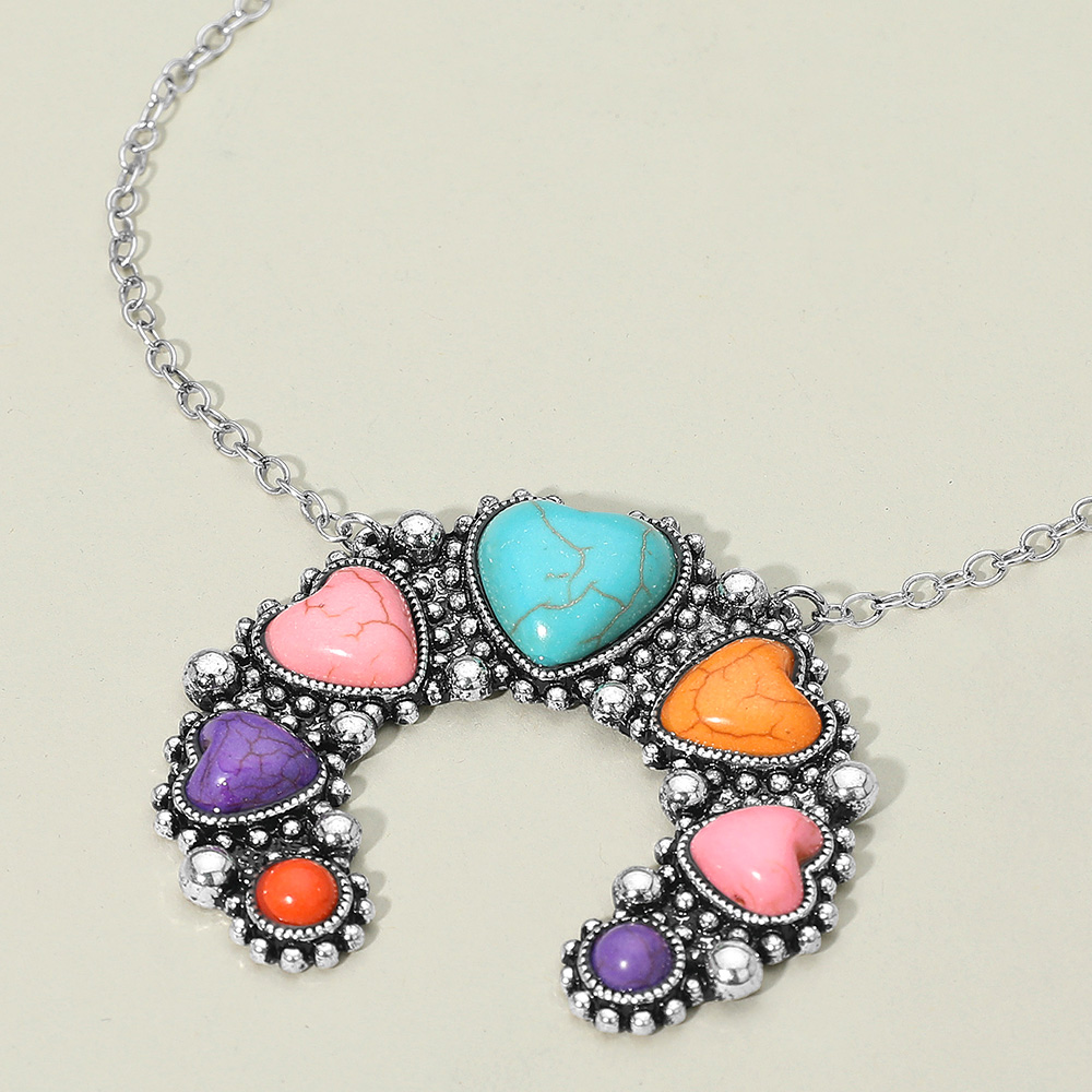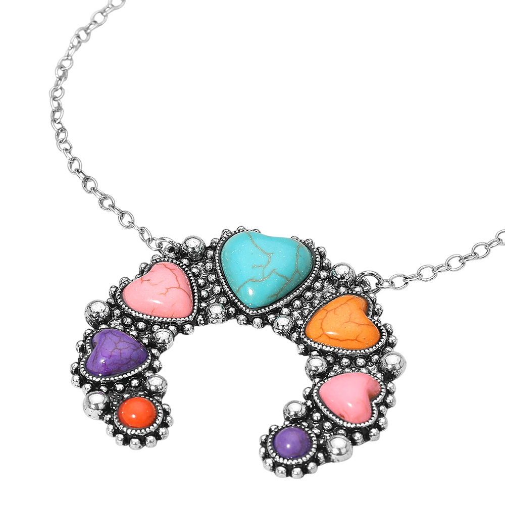 Details • Necklace Size : 18" + 3.25" L • Pendant Size : 2.1" X 2.2" • Show off your vibrant spirit with this boho heart gemstone pendant necklace. Adorned with colorful stones in a vintage-inspired crescent setting, it adds artistic charm and bold personality to any outfit—perfect for free-spirited, statement-making style. • Lead and Nickel Compliant
