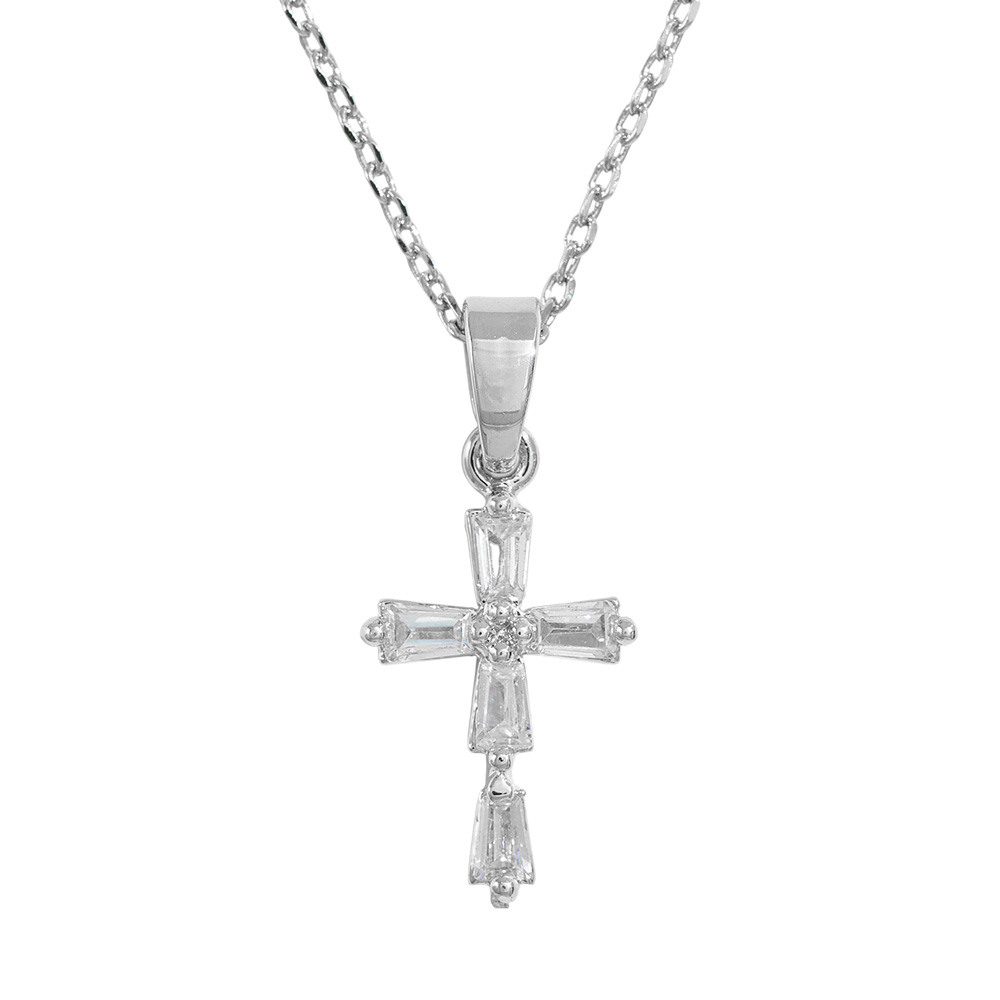 Details • Necklace Size : 16" + 2" L • Pendant Size : 0.4" X 0.7" • This cross pendant necklace showcases a sleek design with baguette-cut stones for a refined, modern touch. A timeless symbol of faith, it’s perfect for everyday wear or as a meaningful gift, offering both elegance and radiant brilliance. • CZ Cubic Zirconia • Gold Dipped • Made In Korea