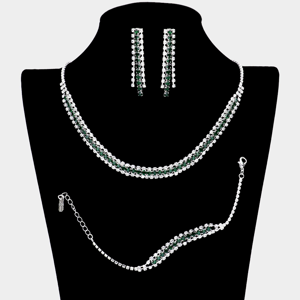 Details • Necklace Size : 16" + 4" L • Decor Size : 0.3" L • Bracelet Size : 0.3" H, 7" + 2" L • Earrings Size : 1.9" L • Elevate your style with this elegant rhinestone jewelry set, featuring a sparkling necklace, matching bracelet, and drop earrings. Perfect for weddings, parties, or evening occasions, this coordinated trio adds timeless radiance and refined sophistication to any ensemble.