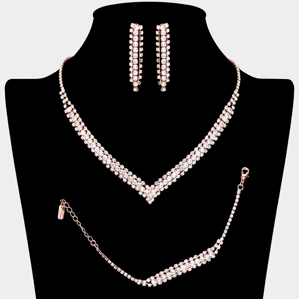 • Elevate any special occasion with this refined jewelry set featuring a matching necklace, bracelet, and earrings. Its sparkling rhinestone arrangement creates a cohesive, eye-catching look designed to enhance formal outfits with timeless sophistication and graceful shine.