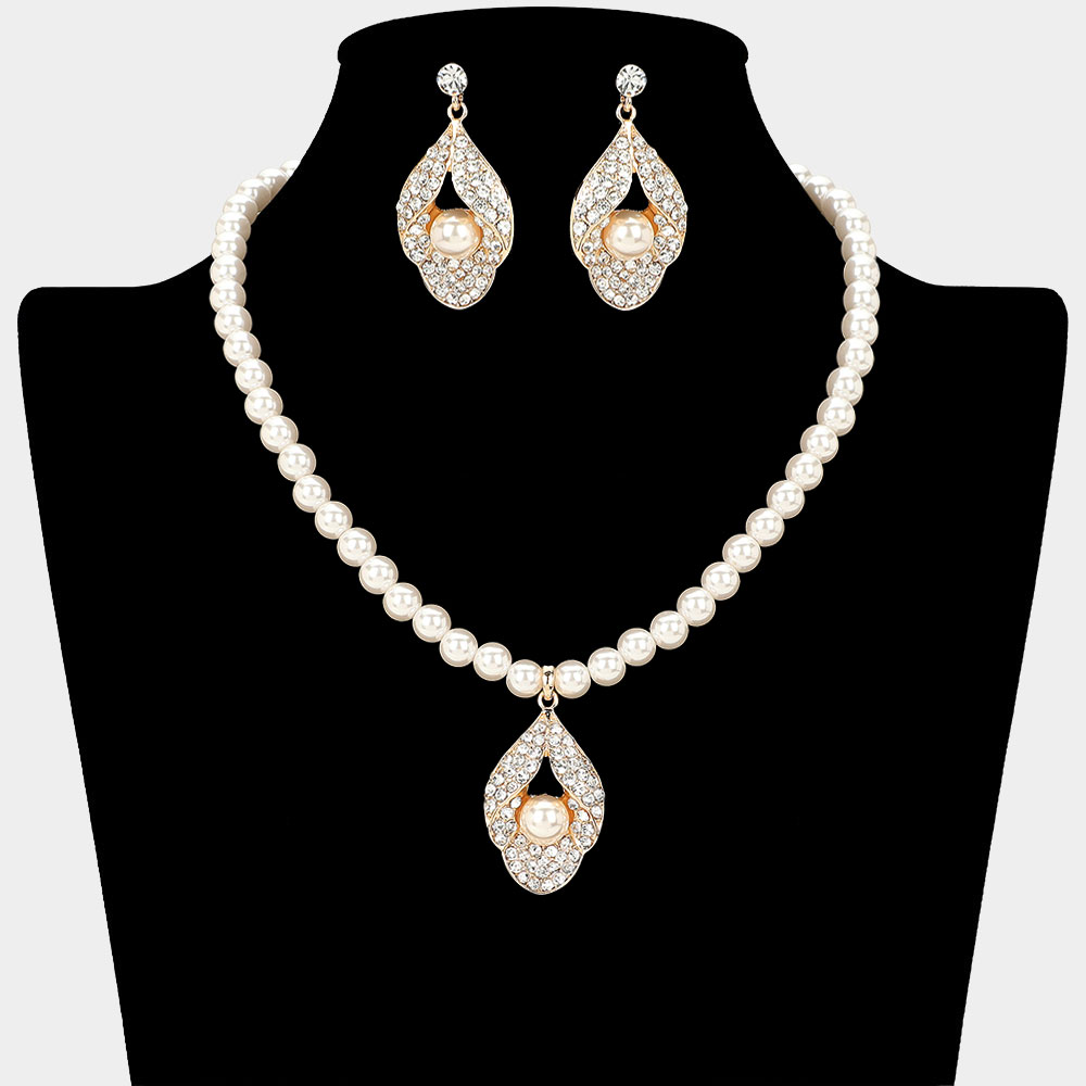 Abstract Rhinestone Paved Pendant Pearl Necklace
