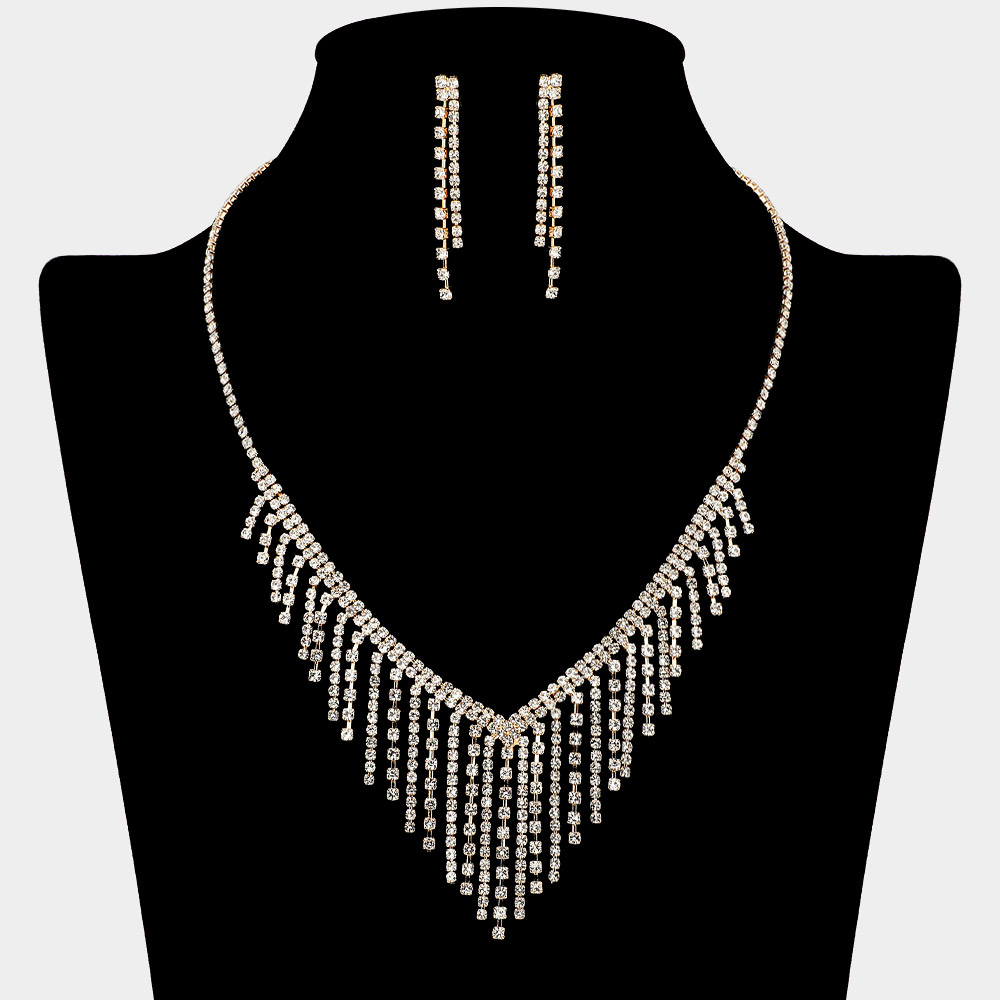 • Add a touch of dramatic elegance with this Cascading Fringe Crystal Necklace and Earring Set. Designed with layered strands of shimmering stones that flow beautifully, this statement set enhances evening gowns and formal attire with radiant sparkle and sophisticated allure for any special occasion.