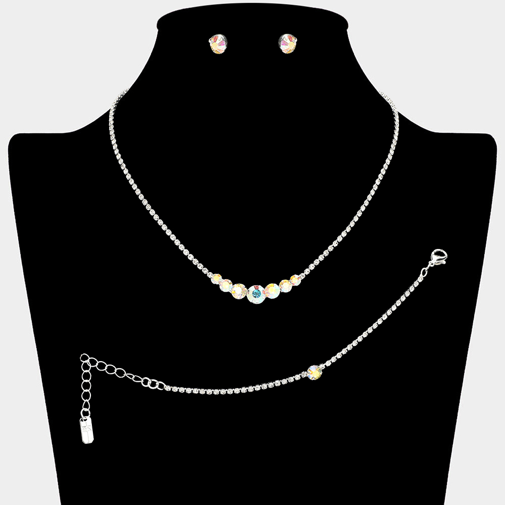 Details • Necklace Size : 15" + 4.5" L • Decor Size : 0.3" L • Bracelet Size : 0.25" H, 5.25" + 2.25" L • Earrings Size : 0.25" L • Timeless matching necklace, stud earring, and bracelet set designed with a clean round stone centerpiece for effortless elegance. Ideal for weddings, formal events, parties, and everyday special occasion styling. A versatile set that delivers refined sparkle and coordinated sophistication.