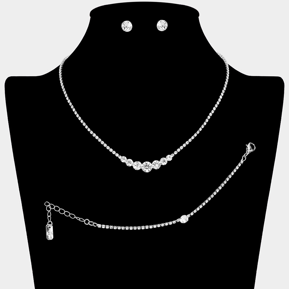 Details • Necklace Size : 15" + 4.5" L • Decor Size : 0.3" L • Bracelet Size : 0.25" H, 5.25" + 2.25" L • Earrings Size : 0.25" L • Timeless matching necklace, stud earring, and bracelet set designed with a clean round stone centerpiece for effortless elegance. Ideal for weddings, formal events, parties, and everyday special occasion styling. A versatile set that delivers refined sparkle and coordinated sophistication.