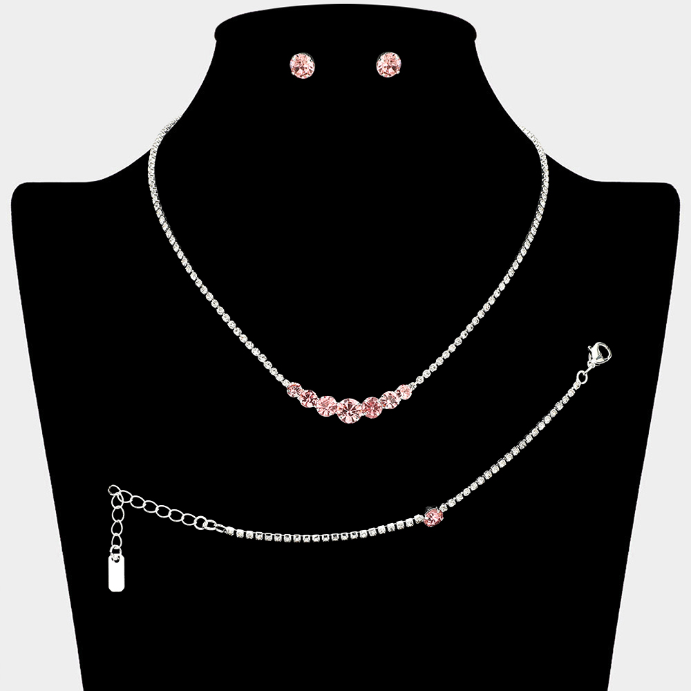 • Timeless matching necklace, stud earring, and bracelet set designed with a clean round stone centerpiece for effortless elegance. Ideal for weddings, formal events, parties, and everyday special occasion styling. A versatile set that delivers refined sparkle and coordinated sophistication.