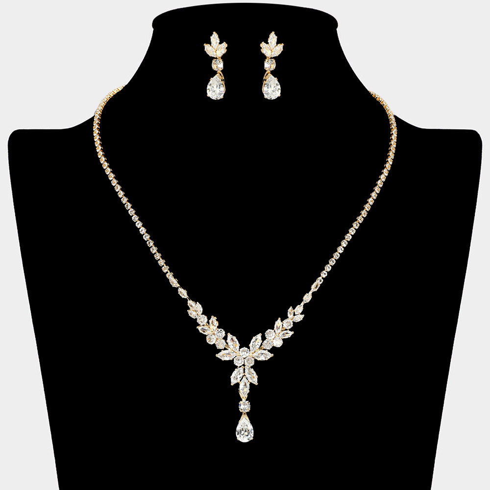 Details • Necklace Size : 16" + 4" L • Decor Size : 1.5" L • Earrings Size : 1" L • This floral teardrop jewelry set showcases a dazzling crystal necklace paired with matching earrings, designed for timeless sophistication. The intricate floral motifs and shimmering stones create a radiant look, making it ideal for weddings, galas, and other elegant occasions. • CZ Cubic Zirconia