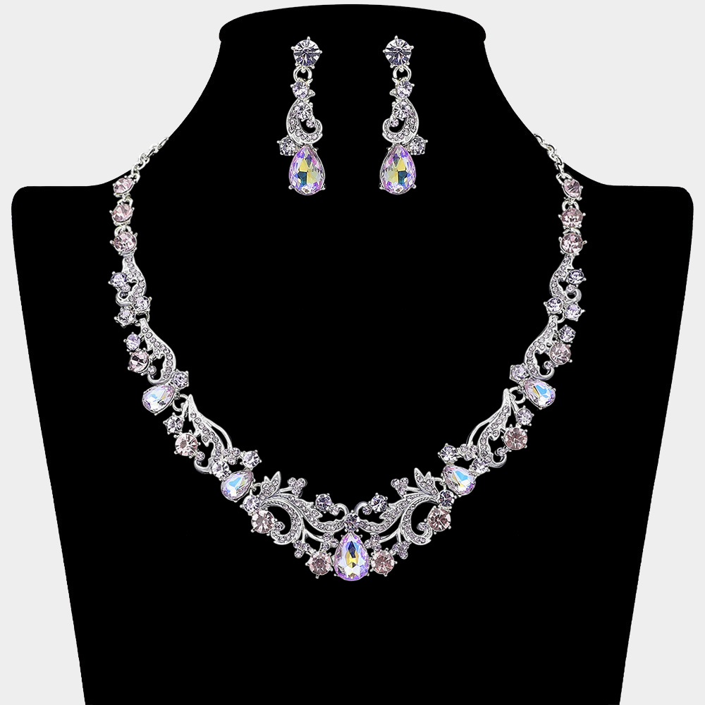 Details • Necklace Size : 18" + 3" L • Decor Size : 0.8" L • Earrings Size : 1.6" L • Stunning jewelry set featuring an ornate crystal necklace with teardrop accents and matching earrings. Perfect for weddings, proms, or formal occasions, adding sophistication and timeless sparkle to any outfit.