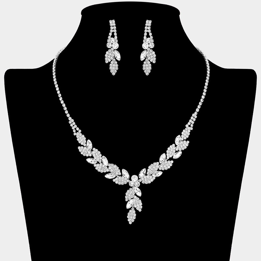 • This elegant necklace and earring set showcases a graceful leaf-inspired design with layered crystal accents and a refined drop silhouette. Perfect for weddings, formal events, proms, and special occasions, it delivers eye-catching sparkle and balanced elegance that enhances evening gowns, bridal looks, and statement outfits.