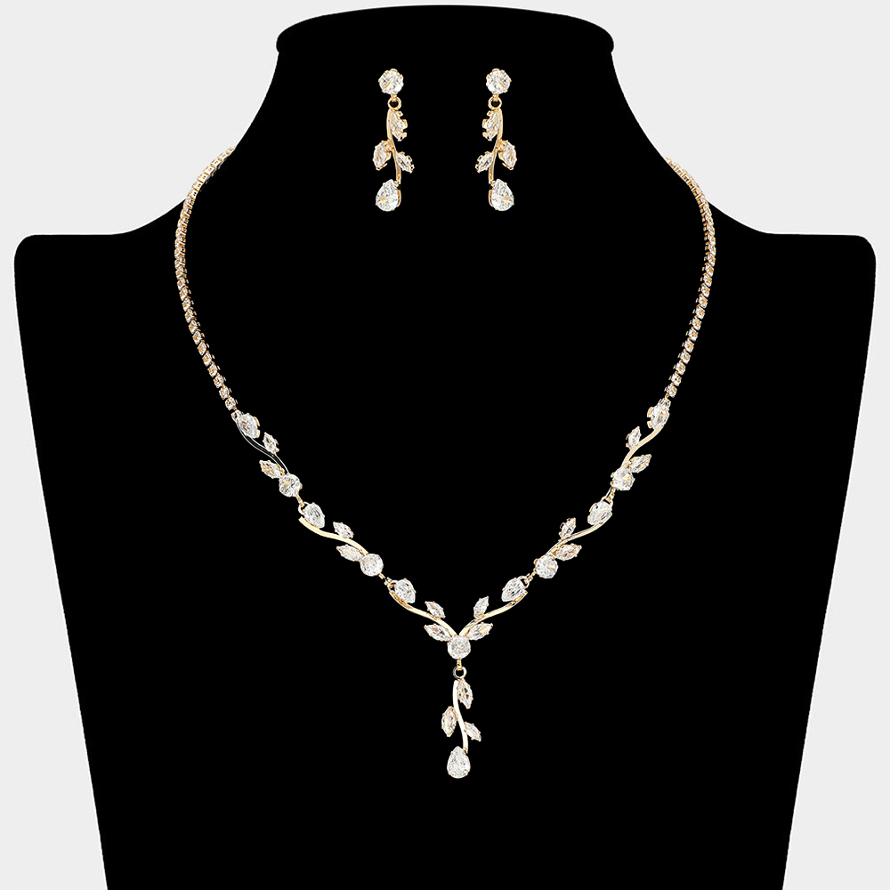 Details • Necklace Size : 16" + 4.5" L • Decor Size : 1.25" L • Earrings Size : 1.25" L • This graceful necklace and earring set features a flowing leaf-inspired design with sparkling crystal accents and delicate drop details. Designed to add elegant movement and refined shine, it is ideal for weddings, formal events, evening wear, and special occasions, offering a timeless statement that complements dresses and gowns beautifully. • CZ Cubic Zirconia