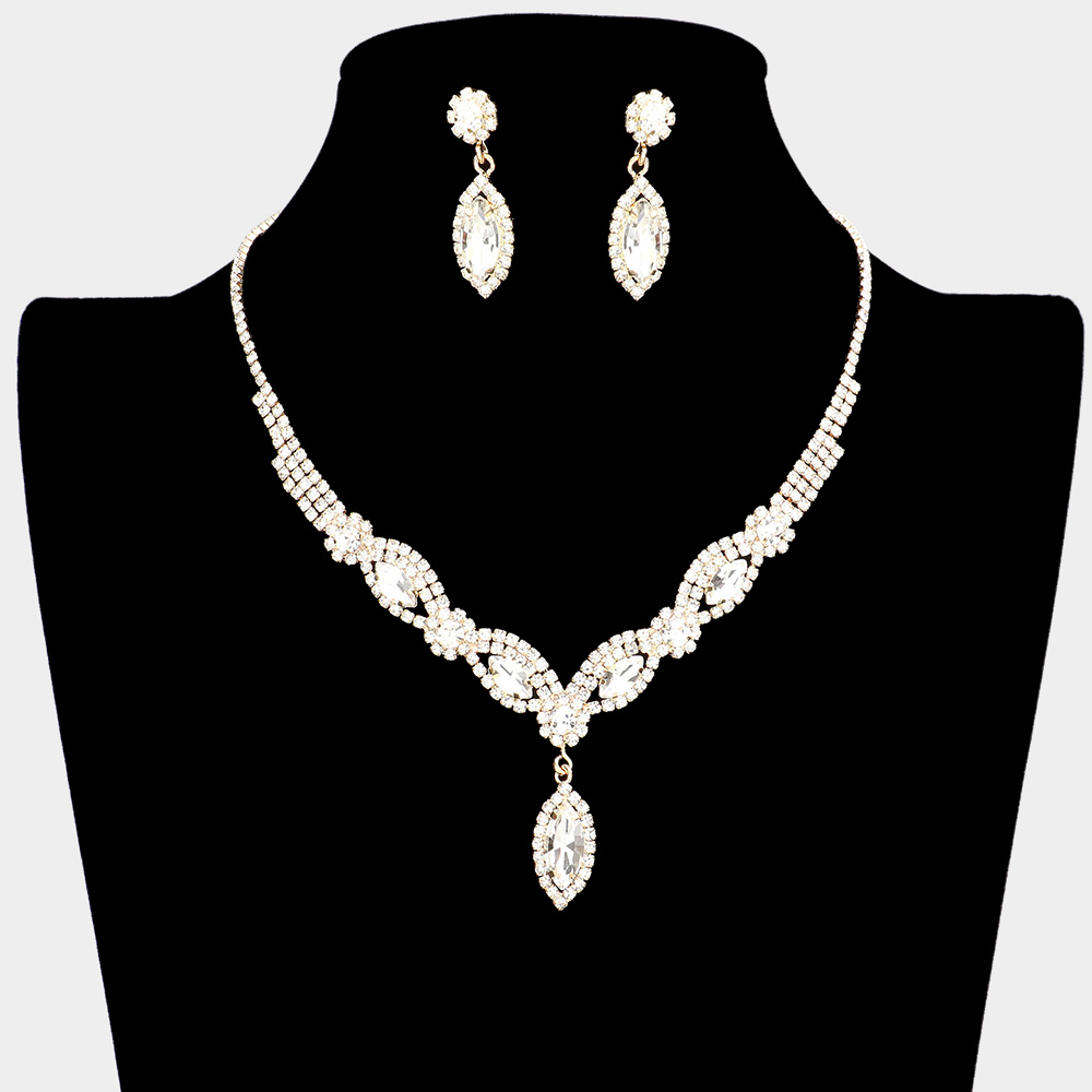 Details • Necklace Size : 14.5" + 3" L • Decor Size : 1.5" L • Earring Size : 1.5" L • Stylish marquise drop rhinestone necklace and earring set featuring a shimmering crystal pendant and intricate layered design. Ideal for weddings, formal events, or parties, this jewelry set delivers a luxurious, radiant touch that enhances any sophisticated or evening ensemble.