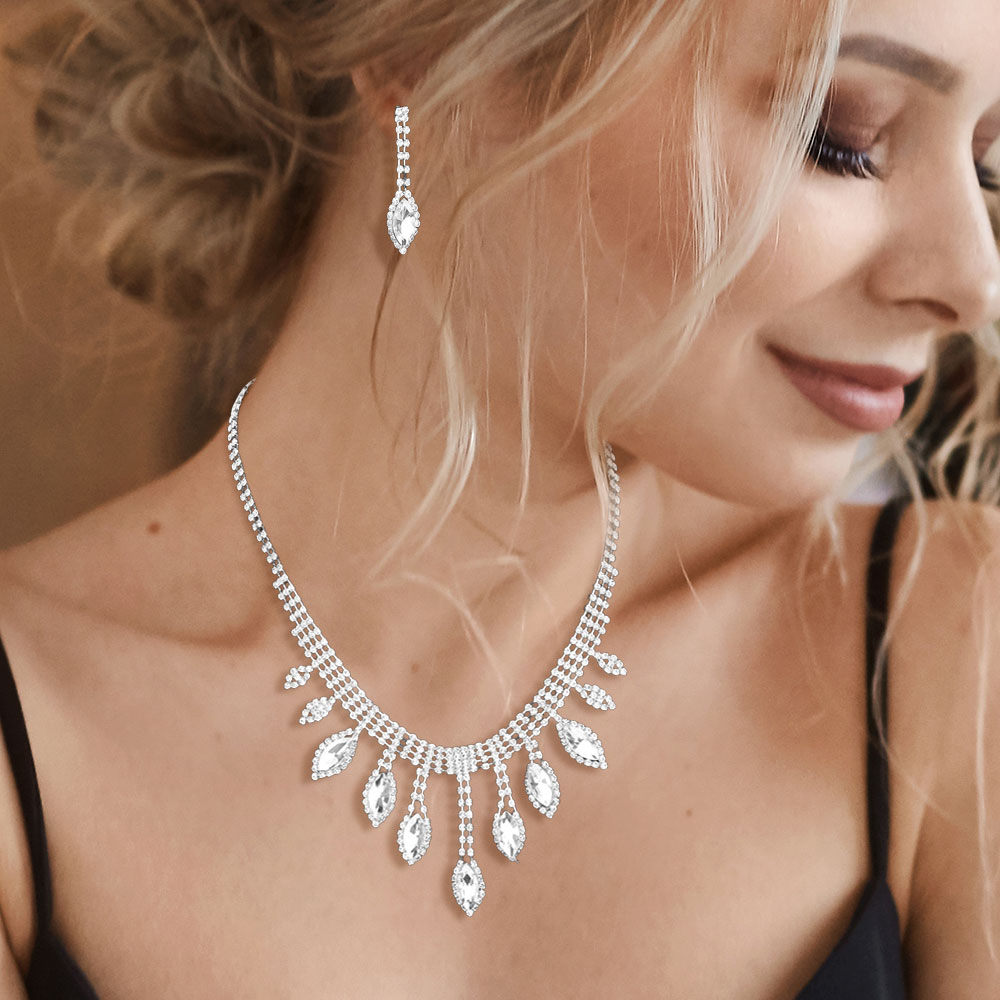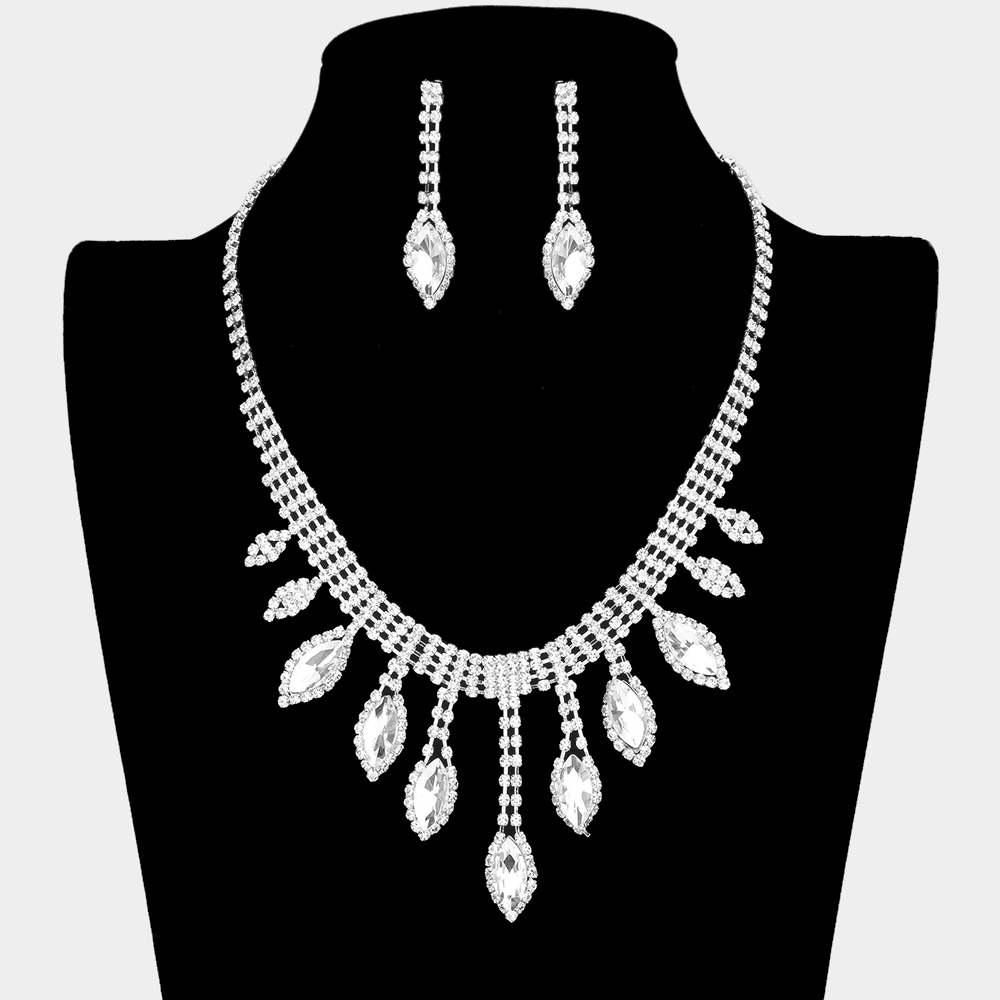 • Elegant marquise crystal necklace and earring set crafted with sparkling rhinestones in a graceful drop design. Perfect for weddings, galas, and special events, this refined jewelry set adds radiant sophistication and timeless charm to any formal or evening look.