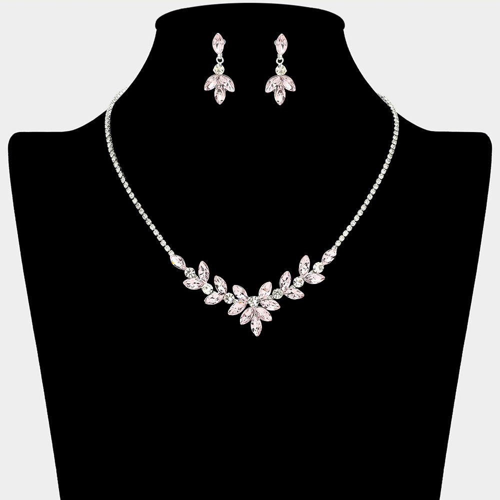 • This refined necklace and matching earring set features a leaf-inspired crystal arrangement that frames the neckline with elegant sparkle. Designed for weddings, bridal parties, formal events, and evening wear, it offers a graceful statement look that enhances dresses, gowns, and special occasion styling with timeless appeal.