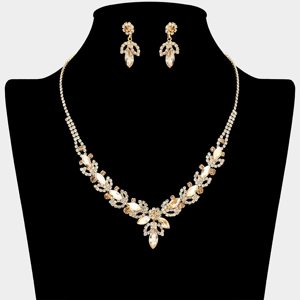 • This statement necklace and matching earring set showcases cascading leaf and drop details in a symmetrical design that frames the neckline beautifully. Ideal for weddings, formal events, evening wear, and special occasions, it delivers refined sparkle and a polished finish to elevated looks.