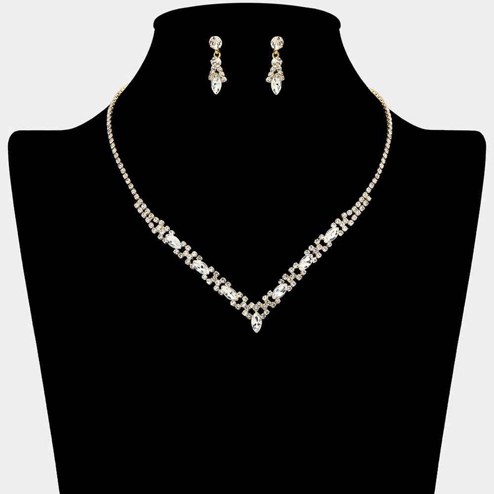 Details • Necklace Size : 15.5" + 4.5" L • Decor Size : 0.5" L • Earrings Size : 0.9" L • Refined necklace and earring set designed with a sleek V-shaped silhouette and coordinated accents for a polished look. Perfect for weddings, formal events, parties, and evening wear. A timeless set that enhances special occasion styling with subtle elegance and sophistication.