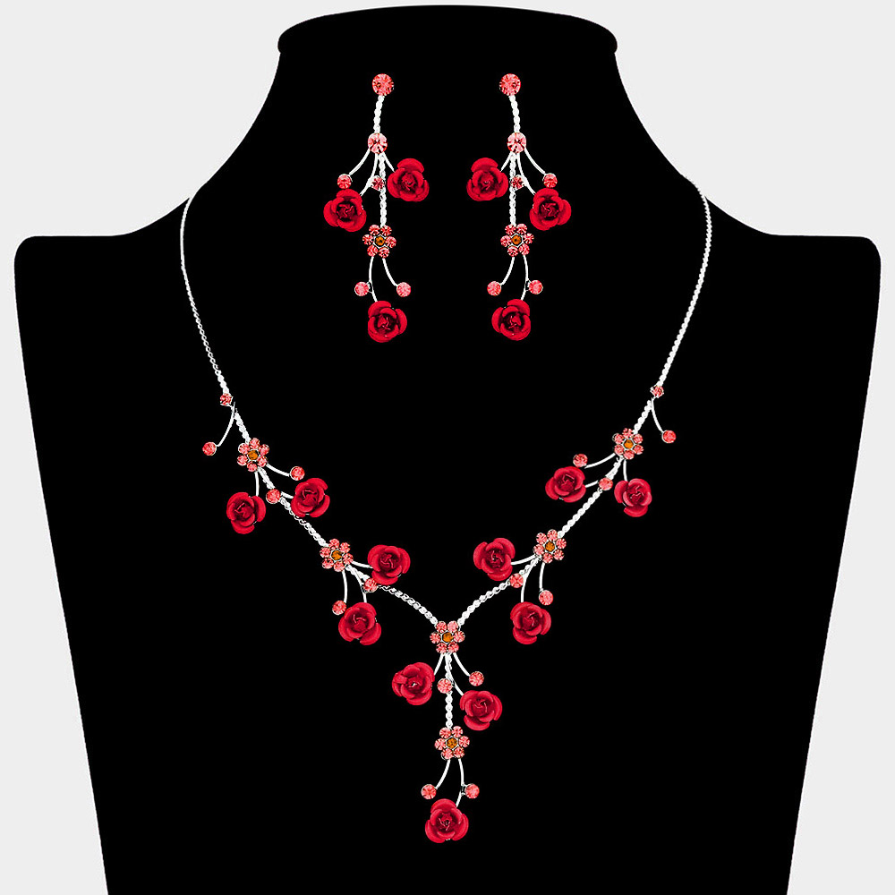 Rhinestone Embellished Rose Flower Cluster Vine Necklace