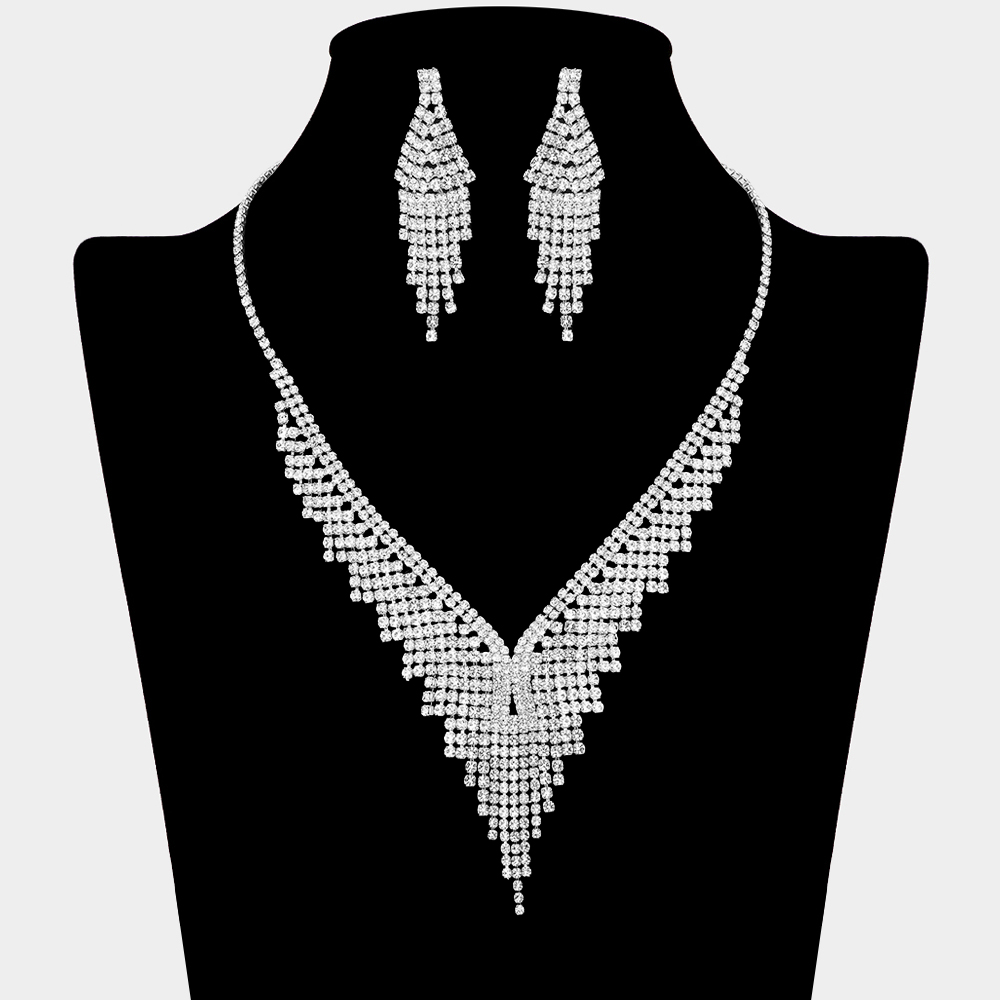 Details • Necklace Size : 16.5" + 2.1" L • Decor Size : 2.25" L • Earrings Size : 2.25" L • This dramatic necklace and earring set features a bold cascading fringe design with layered crystal detailing that creates striking movement and sparkle. Perfect for formal events, evening wear, stage looks, and special occasions, this statement set elevates gowns and dresses with glamorous, eye-catching elegance.