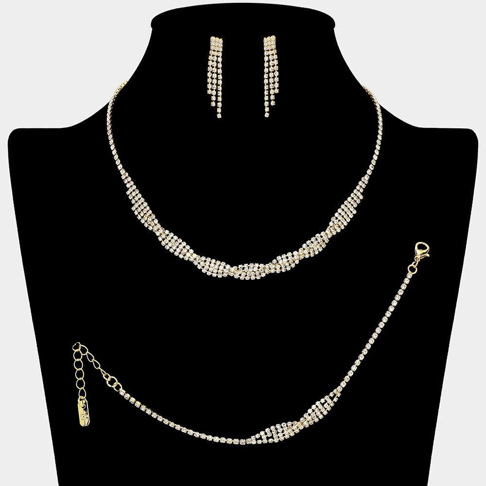 Details • Necklace Size : 14.5" + 4.25" L • Decor Size : 0.3" L • Bracelet Size : 0.25" H, 6.75" + 2.25" L • Earrings Size : 1.25" L • Sophisticated matching necklace, drop earring, and bracelet set designed with a refined layered silhouette for a polished finish. Ideal for weddings, formal events, parties, and evening wear. A timeless coordinated set that delivers graceful sparkle and elevated special occasion styling.