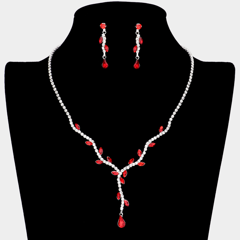 Details • Necklace Size : 16" + 4" L • Decor Size : 1.75" L • Earring Size : 1.5" L • Elegant necklace and earring set with shimmering leaf-shaped stones and a delicate drop pendant. Perfect for weddings, proms, and special events for a refined and glamorous look.