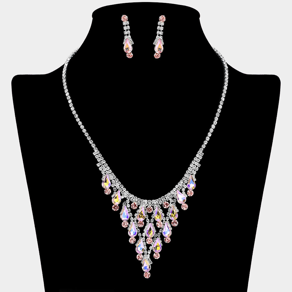 • Elegant teardrop crystal necklace and matching earrings with cascading accents and shimmering detail. Ideal for weddings, galas, and formal occasions, this radiant set brings a luxurious touch to any ensemble.