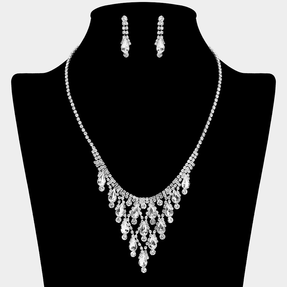 • Elegant teardrop crystal necklace and matching earrings with cascading accents and shimmering detail. Ideal for weddings, galas, and formal occasions, this radiant set brings a luxurious touch to any ensemble.