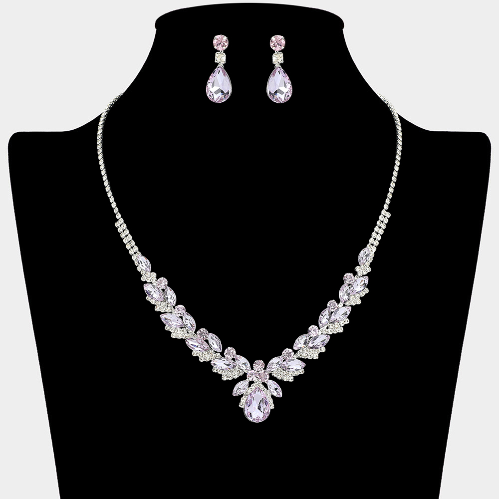 • This elegant statement necklace and matching earring set features layered teardrop accents that create a dramatic yet refined silhouette. Designed to highlight the neckline with graceful sparkle, it is ideal for formal occasions, bridal styling, evening events, and upscale boutique collections.