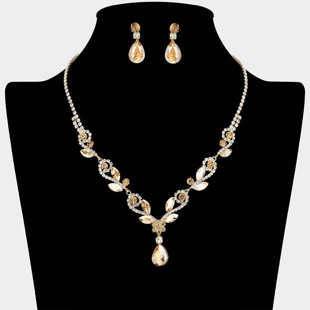 Details • Necklace Size : 16" + 4.5" L • Decor Size : 1.24" L • Earrings Size : 1" L • This elegant necklace and matching earring set features a graceful teardrop design with layered crystal details that highlight the neckline beautifully. Ideal for weddings, formal events, proms, and evening occasions, it delivers timeless elegance and eye-catching sparkle for special celebrations.