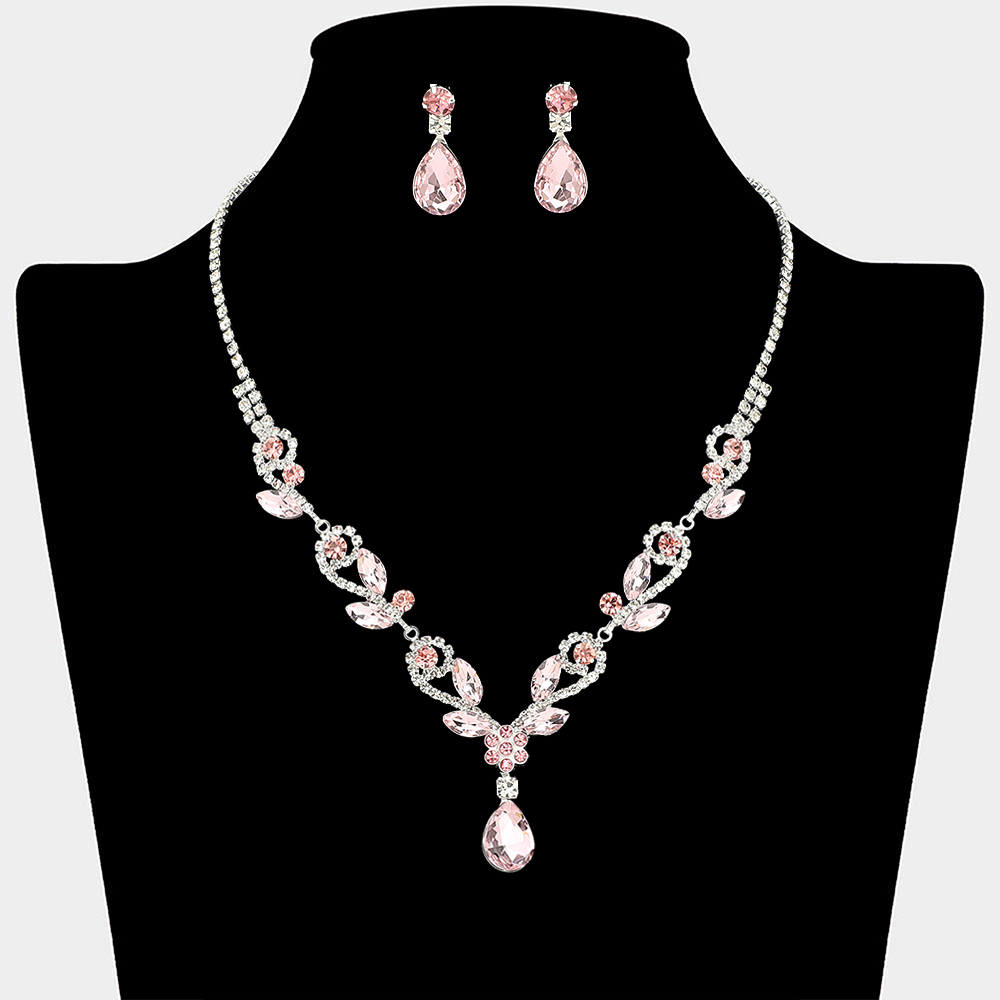Details • Necklace Size : 16" + 4.5" L • Decor Size : 1.24" L • Earrings Size : 1" L • This elegant necklace and matching earring set features a graceful teardrop design with layered crystal details that highlight the neckline beautifully. Ideal for weddings, formal events, proms, and evening occasions, it delivers timeless elegance and eye-catching sparkle for special celebrations.