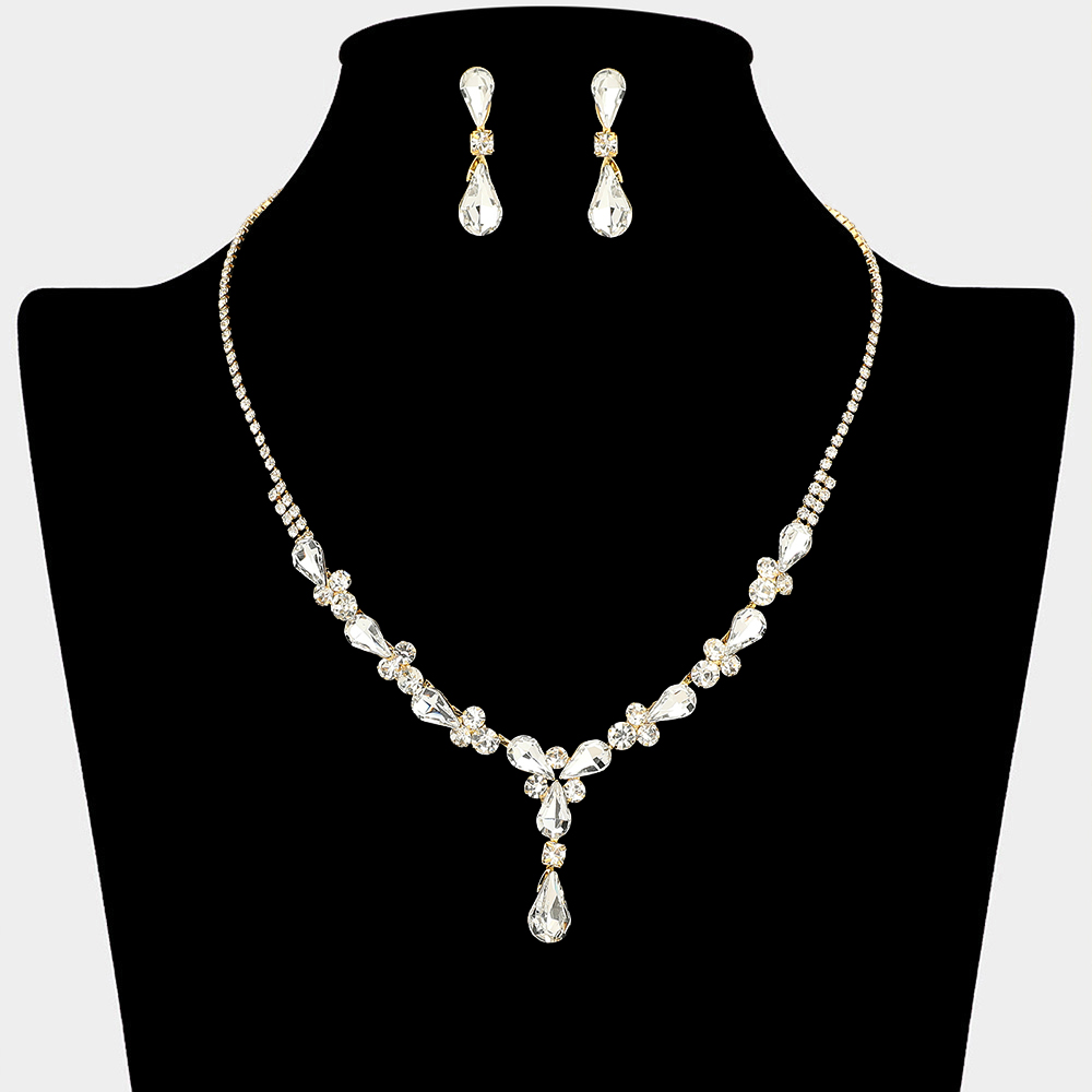 • This elegant necklace and earring set features a graceful teardrop crystal design that highlights the neckline with refined sparkle. Ideal for weddings, bridal looks, formal occasions, and evening wear, it delivers a timeless statement that complements gowns, dresses, and special event styling with effortless sophistication.