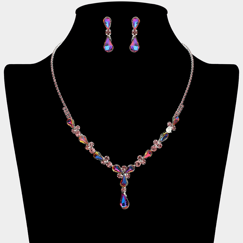 Details • Necklace Size : 16" + 4.5" L • Decor Size : 1.24" L • Earrings Size : 1.2" L • This elegant necklace and earring set features a graceful teardrop crystal design that highlights the neckline with refined sparkle. Ideal for weddings, bridal looks, formal occasions, and evening wear, it delivers a timeless statement that complements gowns, dresses, and special event styling with effortless sophistication.