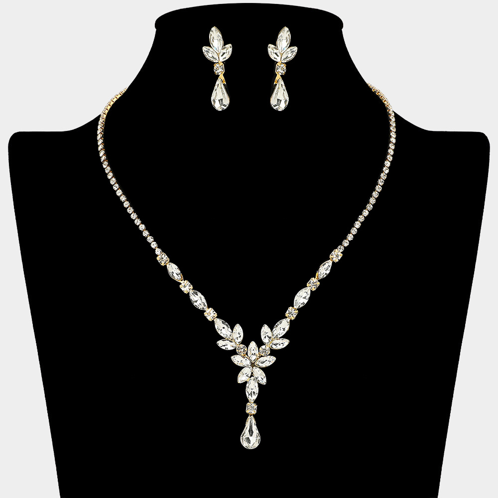 Details • Necklace Size : 16" + 4.5" L • Decor Size : 1.7" L • Earrings Size : 1.25" L • Add refined sparkle to your look with this crystal teardrop leaf necklace and earring set, featuring elegant marquise-cut accents and a delicate drop pendant. Perfect for brides, evening galas, or special occasions, this timeless jewelry set enhances any outfit with radiant sophistication.