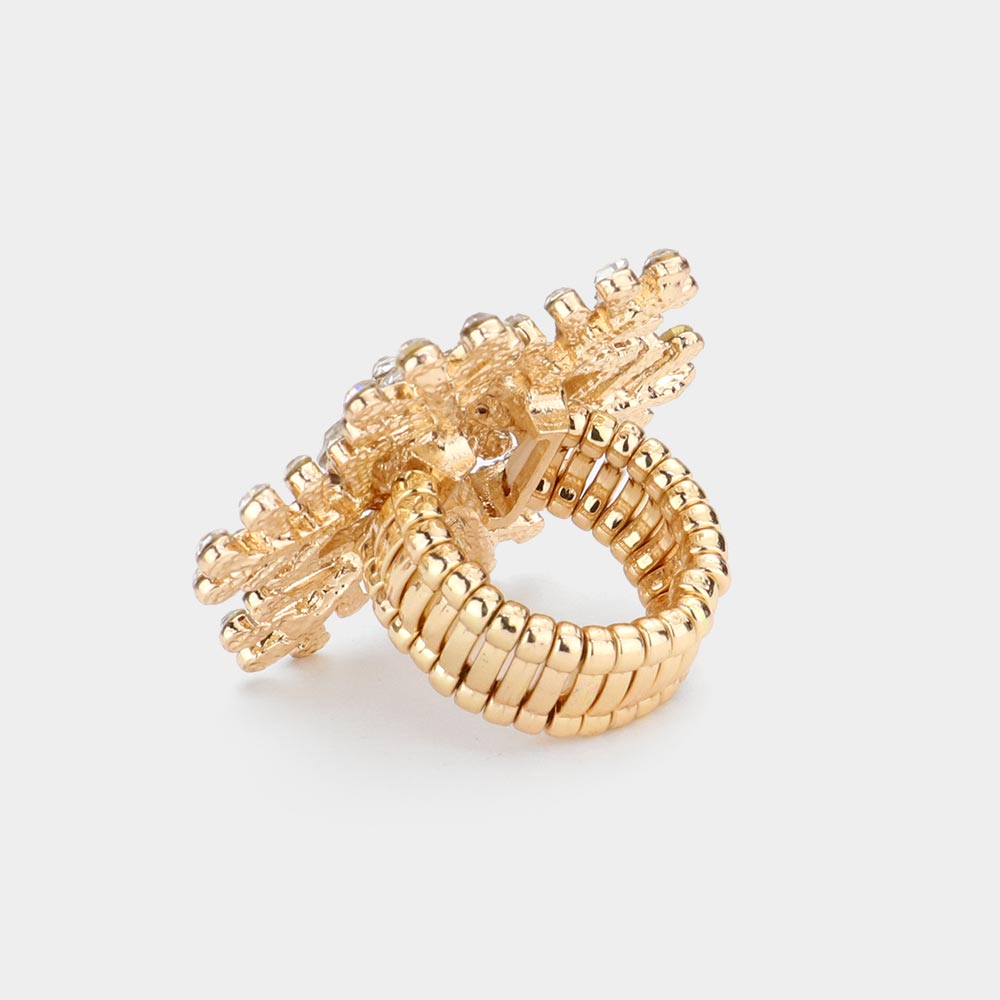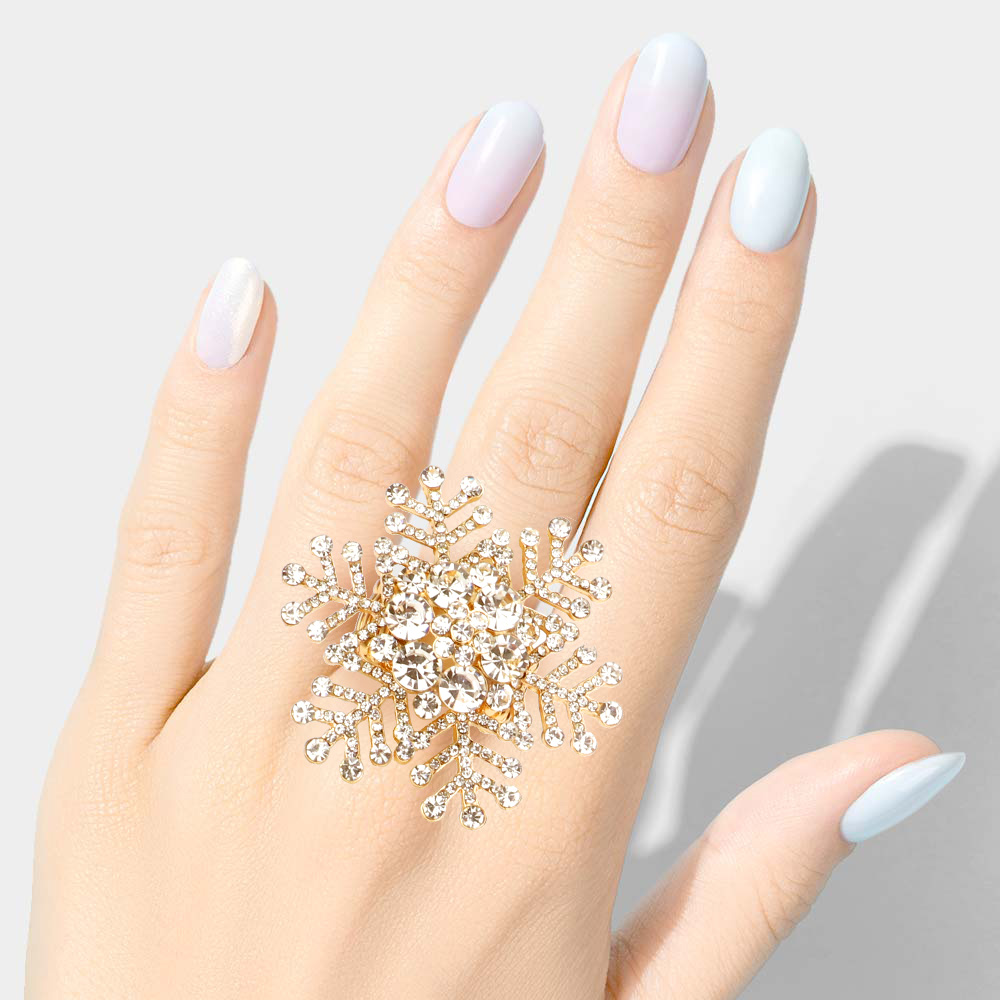 Details • Size : 1.8" X 1.8" • Stretchable • Add a touch of winter sparkle to your look with this crystal snowflake statement ring. Designed with intricate detailing and radiant shine, it’s the perfect accessory for festive occasions, holiday parties, or elevating your everyday style with dazzling elegance. • Lead and Nickel Compliant