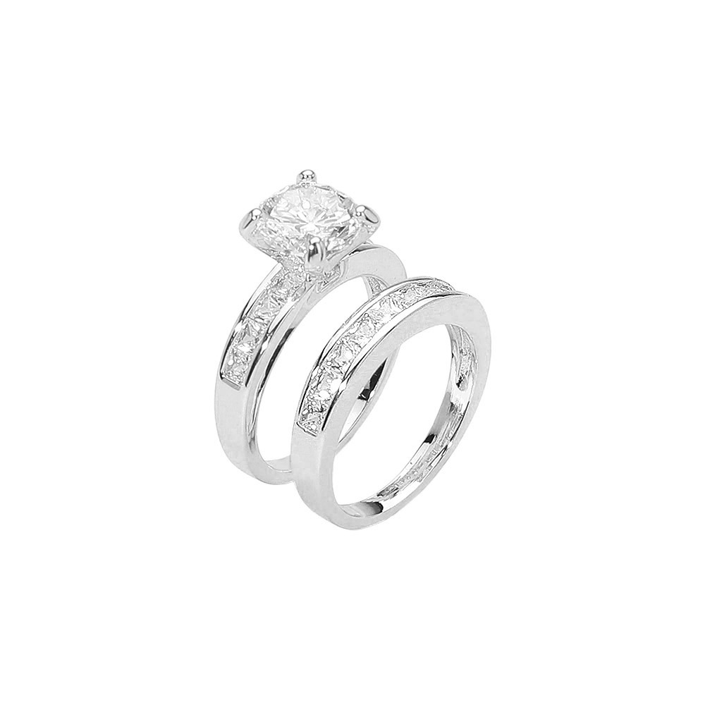 • Sophisticated two piece ring set featuring a solitaire cubic zirconia centerpiece paired with a matching band accented with sparkling stones. Designed for timeless elegance, this coordinated set makes a perfect choice for engagements, weddings, or refined everyday wear.