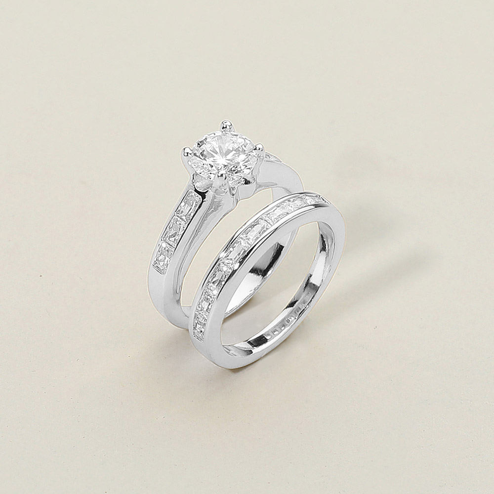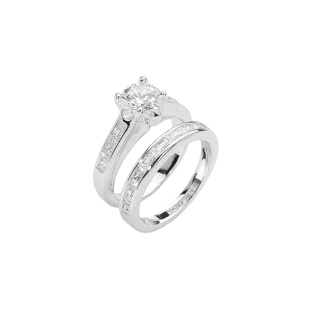 • Refined two piece ring set featuring a round cut cubic zirconia centerpiece paired with a coordinating band adorned with channel-set stones. This timeless design offers elegance and brilliance, making it ideal for engagements, weddings, or special occasion wear.