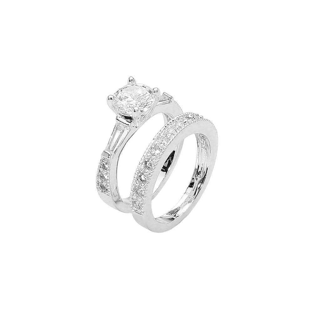 • Elegant two piece ring set featuring a round cut cubic zirconia centerpiece complemented by a matching band adorned with shimmering pave accents. A timeless and refined design perfect for engagements, weddings, or adding sophisticated sparkle to everyday looks.