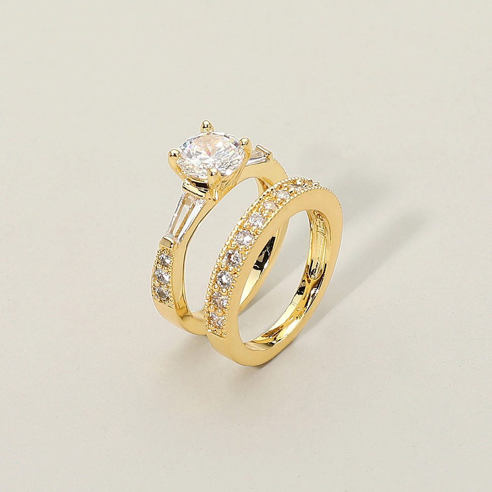 Details • Size : 0.2" - 0.25" H • Elegant two piece ring set featuring a round cut cubic zirconia centerpiece complemented by a matching band adorned with shimmering pave accents. A timeless and refined design perfect for engagements, weddings, or adding sophisticated sparkle to everyday looks. • CZ Cubic Zirconia
