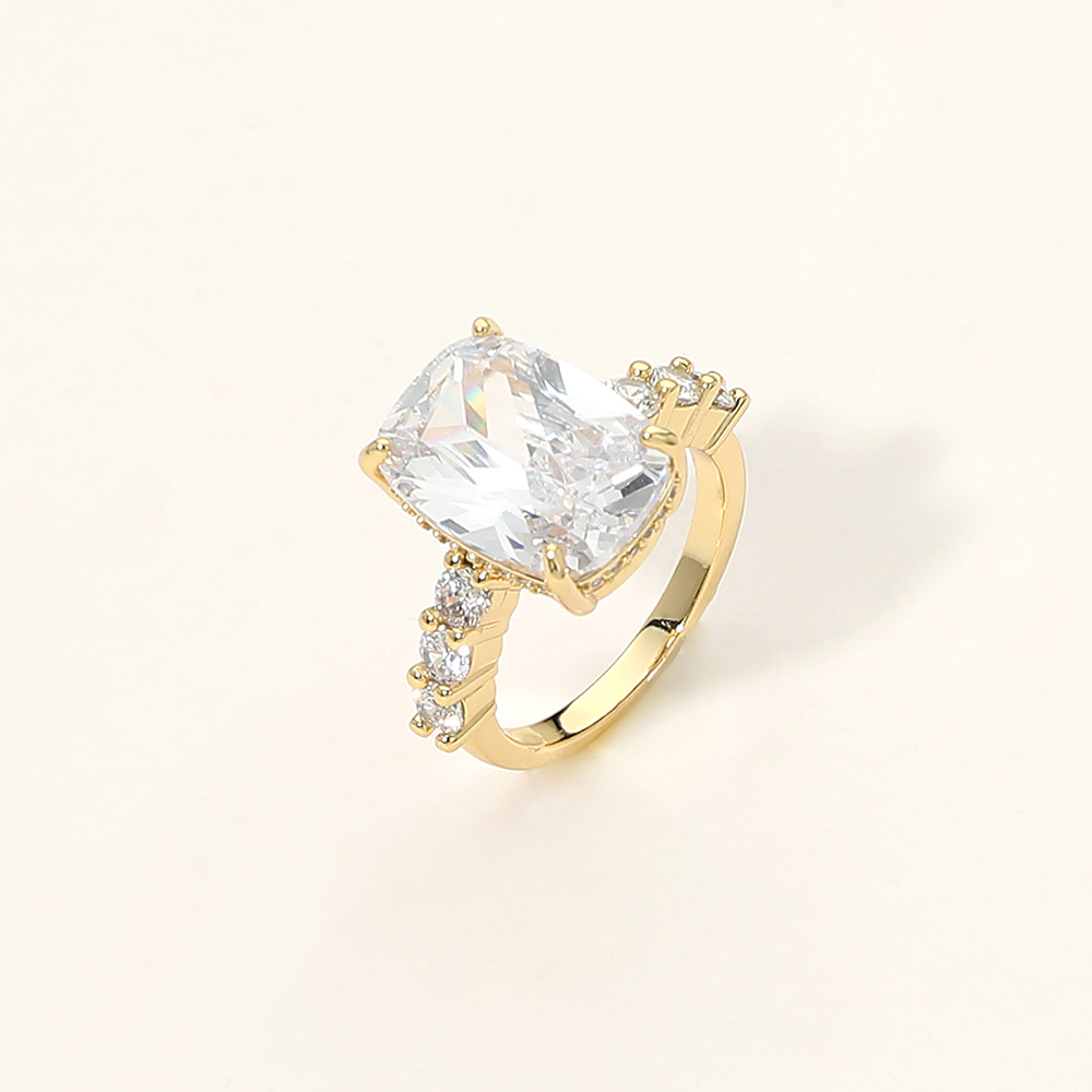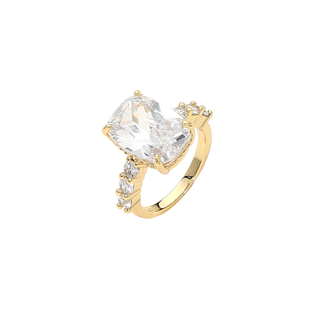 • This statement ring showcases a bold cushion cut CZ centerpiece with refined side accents that add depth and brilliance. Designed for standout style, it elevates everyday looks and special occasion outfits alike. The elegant silhouette makes it perfect worn alone as a focal piece or layered with minimal bands for a polished, fashion-forward finish.