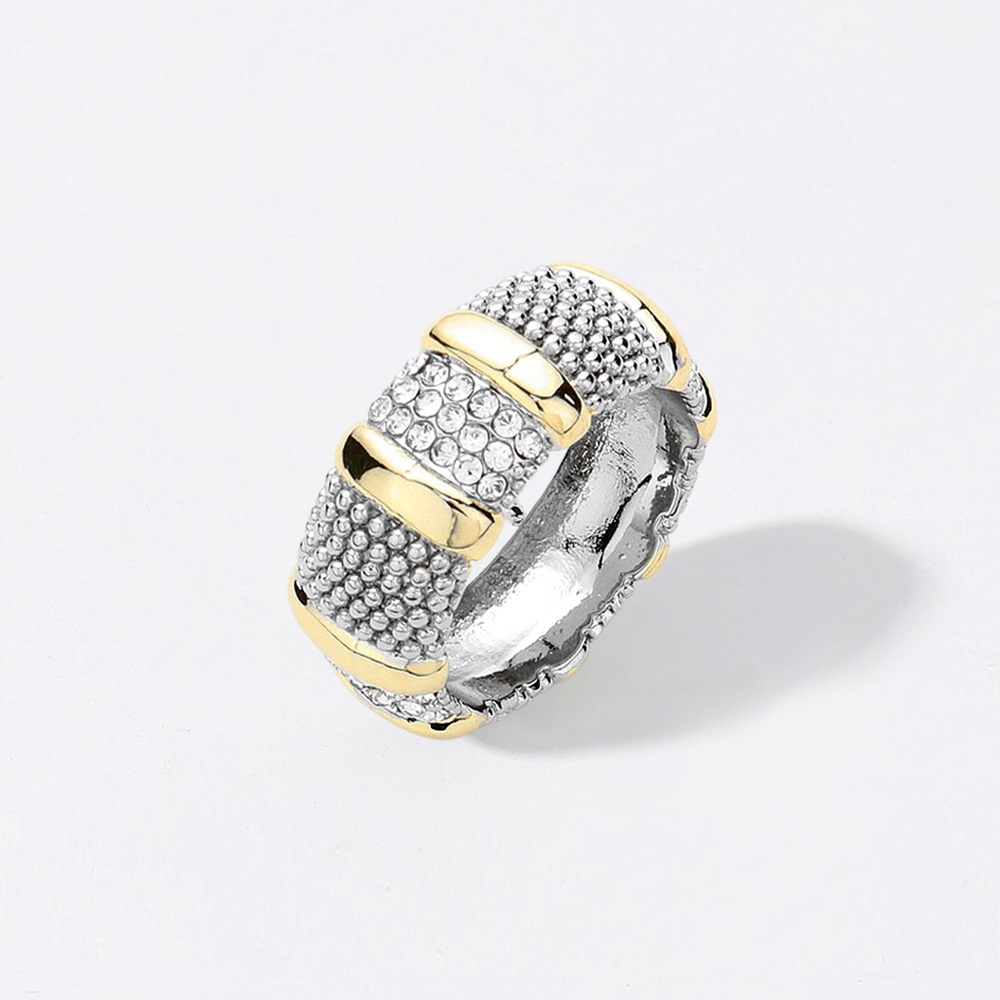 • Stylish wide band ring with shimmering pave texture and bold stripe accents. A statement piece ideal for modern and chic looks.