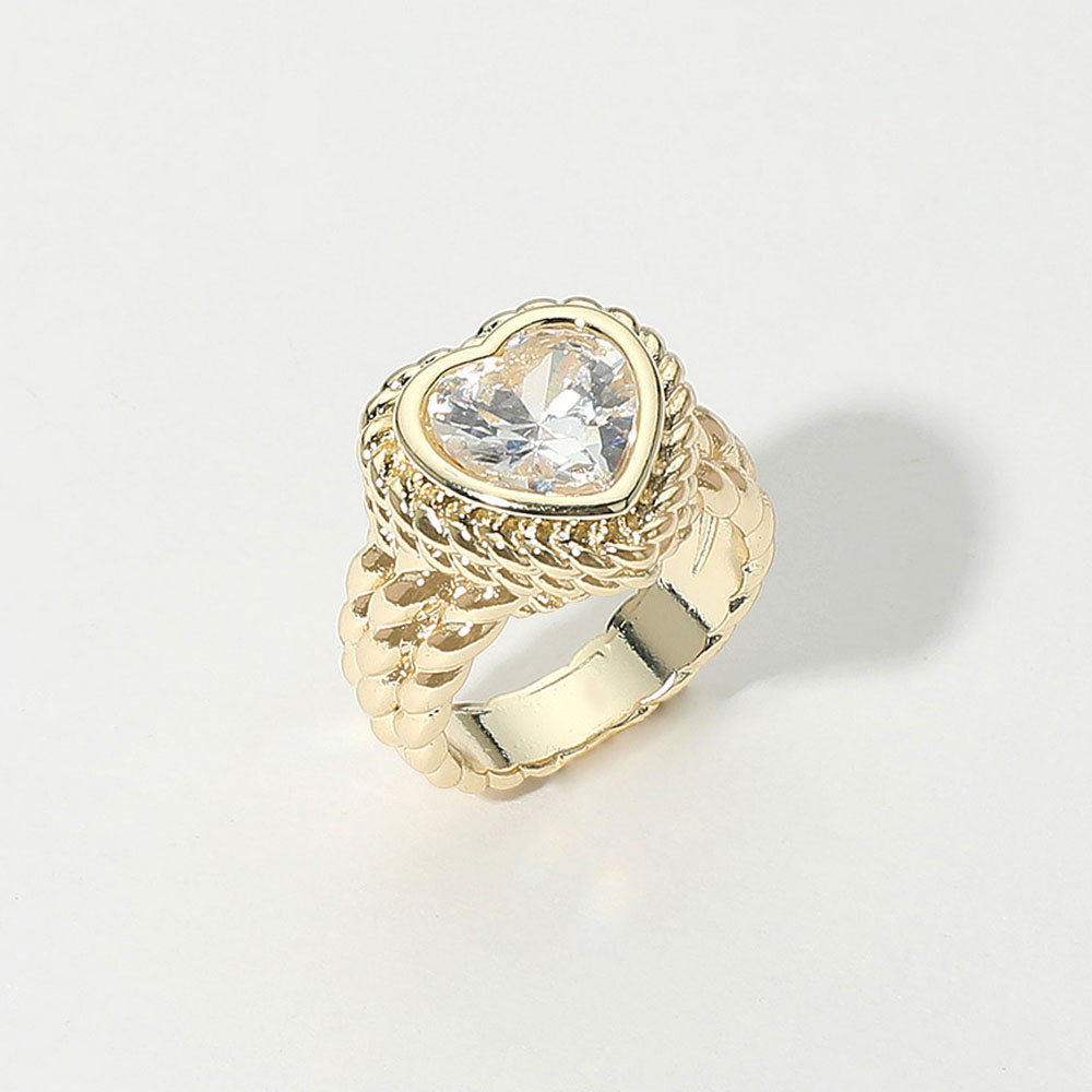 Details • Size : 0.75" H • Showcase elegance with this heart-shaped cubic zirconia ring featuring a dazzling center stone and intricate braided band design. Perfect for adding a romantic touch to any outfit, this statement ring combines timeless style and modern sophistication, making it an ideal accessory or thoughtful gift. • CZ Cubic Zirconia