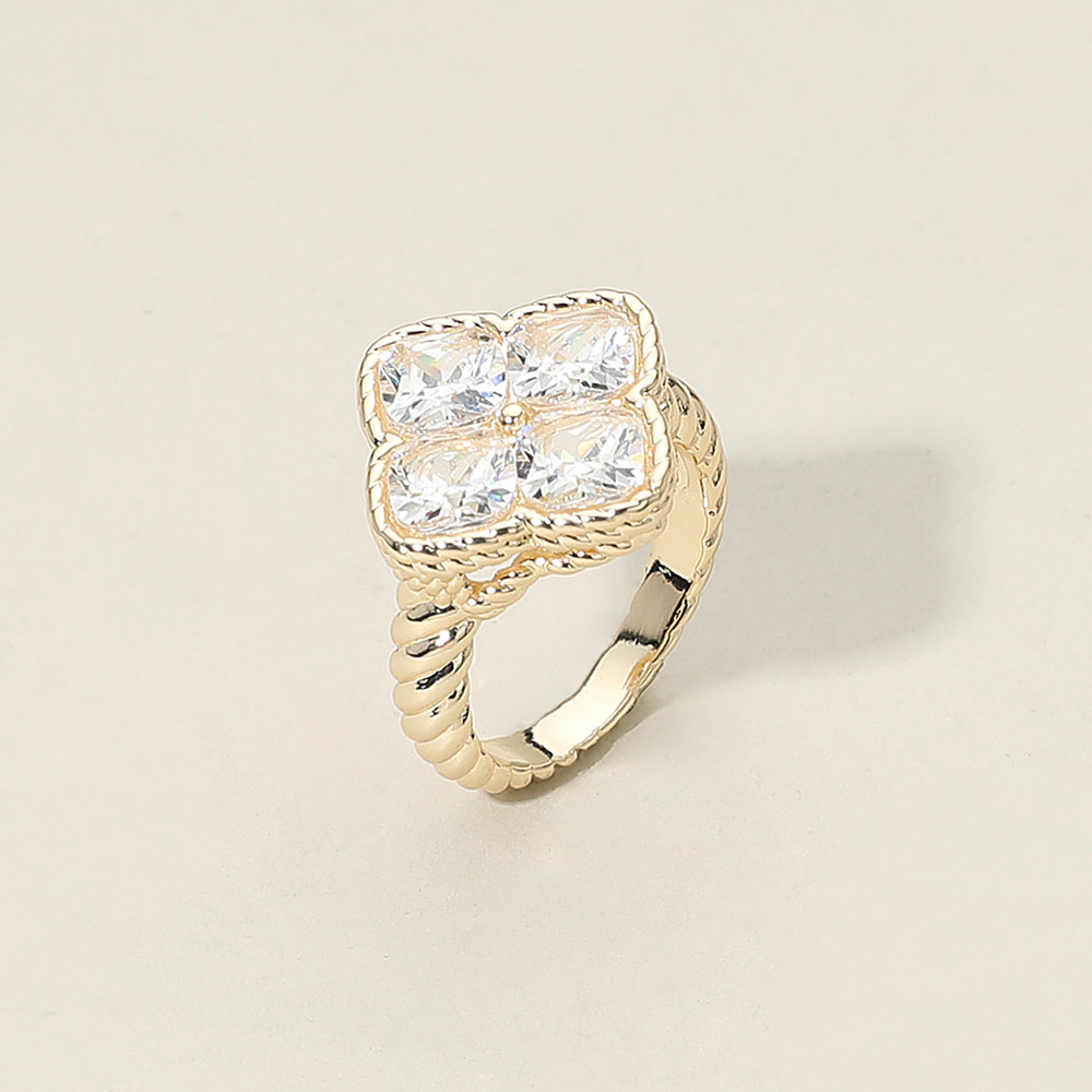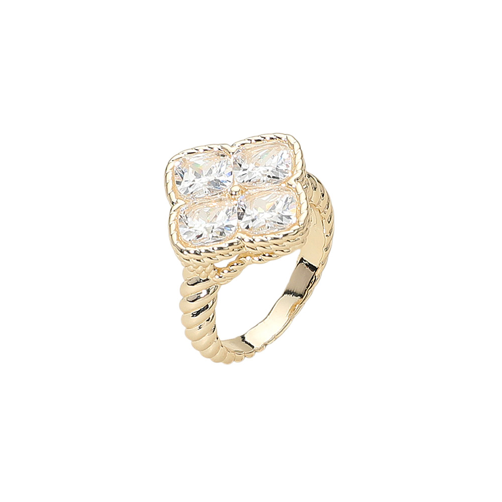 Details • Size : 0.75" H • Elegant ring showcasing a square cluster design with four faceted cz gemstones set in a raised border. The textured band adds a refined touch, making this geometric ring a standout accessory that balances color, form, and sophistication for any outfit or occasion. • CZ Cubic Zirconia